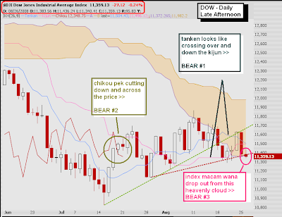K, the bearish price-Kijun cross, bearish Tenkan-Kijun impending-cross, and the bearish Chikou Span confirmation cross - all identified correctly. The impending bearish cloud exit is identified correctly as well.